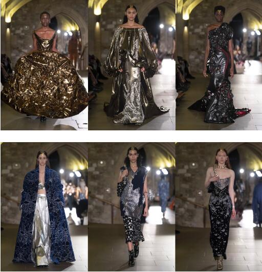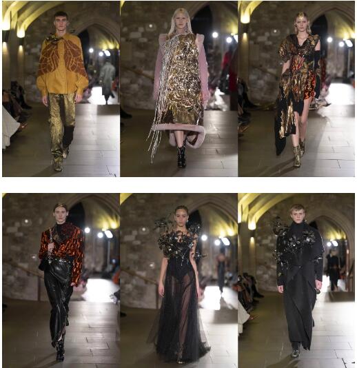 本季时装秀于伦敦市政厅地下室启幕,也是这一英国最古老的中世纪地下室举办的首次时装秀。繁复的中世纪彩绘玻璃召唤神秘年代的回响,雕琢的拱廊与错落的灯光交织出历史的厚重感。爱德华时期的雕饰——花朵和盾牌,映衬着本季梦魇般迷幻的色彩与宇宙晦暗时期自然与人类共栖的迷离样态。飞蛾,甲虫,掩映于廊柱冷峻的暗影,织物穿越拱形穹顶延宕的纵深。丝绒,皮革,金属交叠而生,直抵人心,指引观众透过时装去感受体感与织物的关系,自然与个体转瞬或永痕的辗转。
